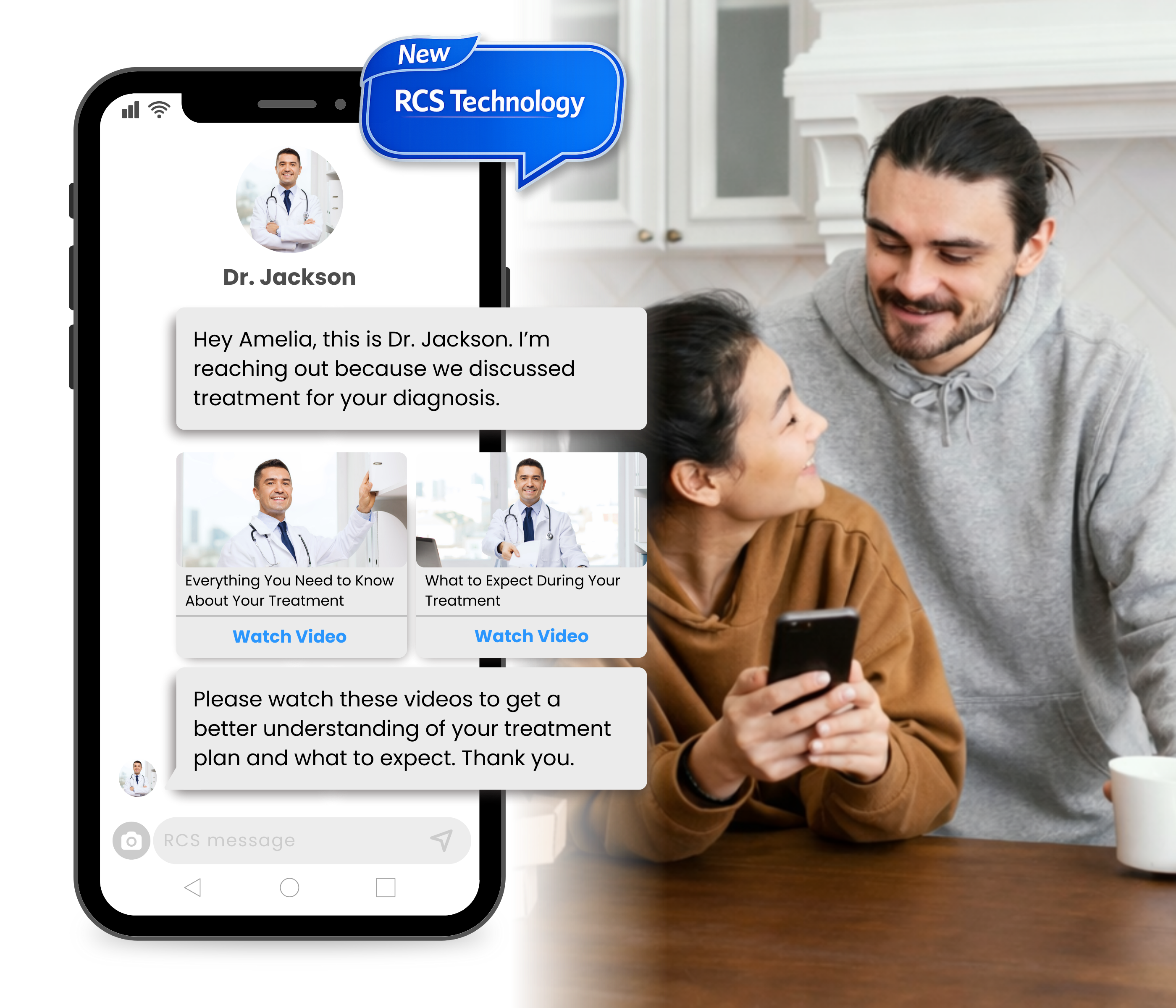 RCS brings app-like experiences to text messaging: verified sender badges, rich media carousels, interactive buttons, video playback—all inside the patient’s default messaging inbox.