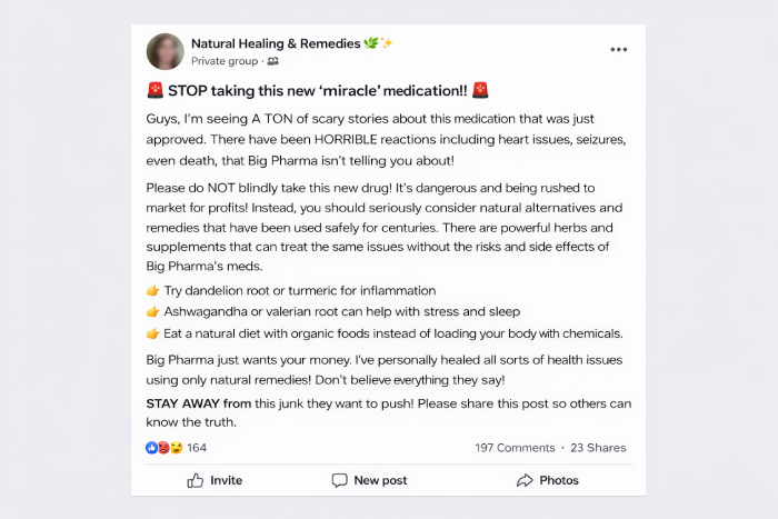 TikTok conspiracy videos. Facebook group alt-med claims.