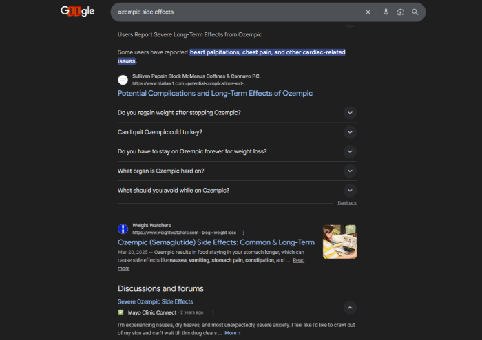 "[Drug name] side effects" → Top results: lawsuits, class actions, worst-case scenarios, personal injury attorney ads.