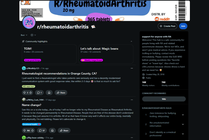 r/rheumatoidarthritis. 847 upvotes, 312 comments. Anonymous anecdotes drive treatment fear. No clinical context. No physician voice. This thread appears on page 1 of Google when patients search their medication name.